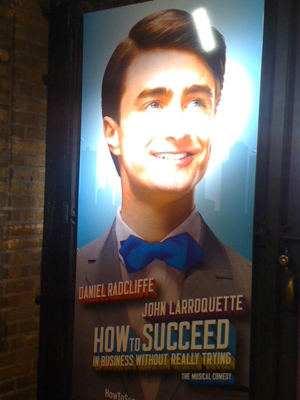After dinner (which was served by my favorite singing tenor at Salon, David Ballard!), we went to see How to Succeed in Business Without Really Trying, starring Daniel Radcliffe and John Laroquette. The production value and look of the show is gorgeous – great sets, lighting, costumes, singing, and some fantastically clever and funny choreography. Radcliffe, while not having perfect vocal tone, is well-cast as Finch (and jumped into some athletic dancing during “Brotherhood of Man”), and Laroquette was appropriately blustery and funny as the head boss. I’m just not a fan of the show itself – although it’s deliberately set in the early 60’s, the obvious misogyny regarding the role, attitude, and sexual place men have in mind for women in the workplace is a bit dated. I could only have so many “ha ha, see, this show is dated and they’re playing it for real to make a point” thoughts in my head. And the satire regarding office life is funny, but has been portrayed before and since in movies and theater that it’s lost it’s edge to me here. Plus, the lead character of Finch is as corrupt as the office ladder he is trying to climb. True, he doesn’t outright lie (much), but he omits answers to direct questions to seem like someone or something else, just to get ahead. When the crisis comes during the second act, I truly looked forward to him learning a lesson or having some sort of comeuppance. ps. That said, I could probably play Hedy La Rue (T & A abounding) or the head secretary with the high notes, Miss Jones.